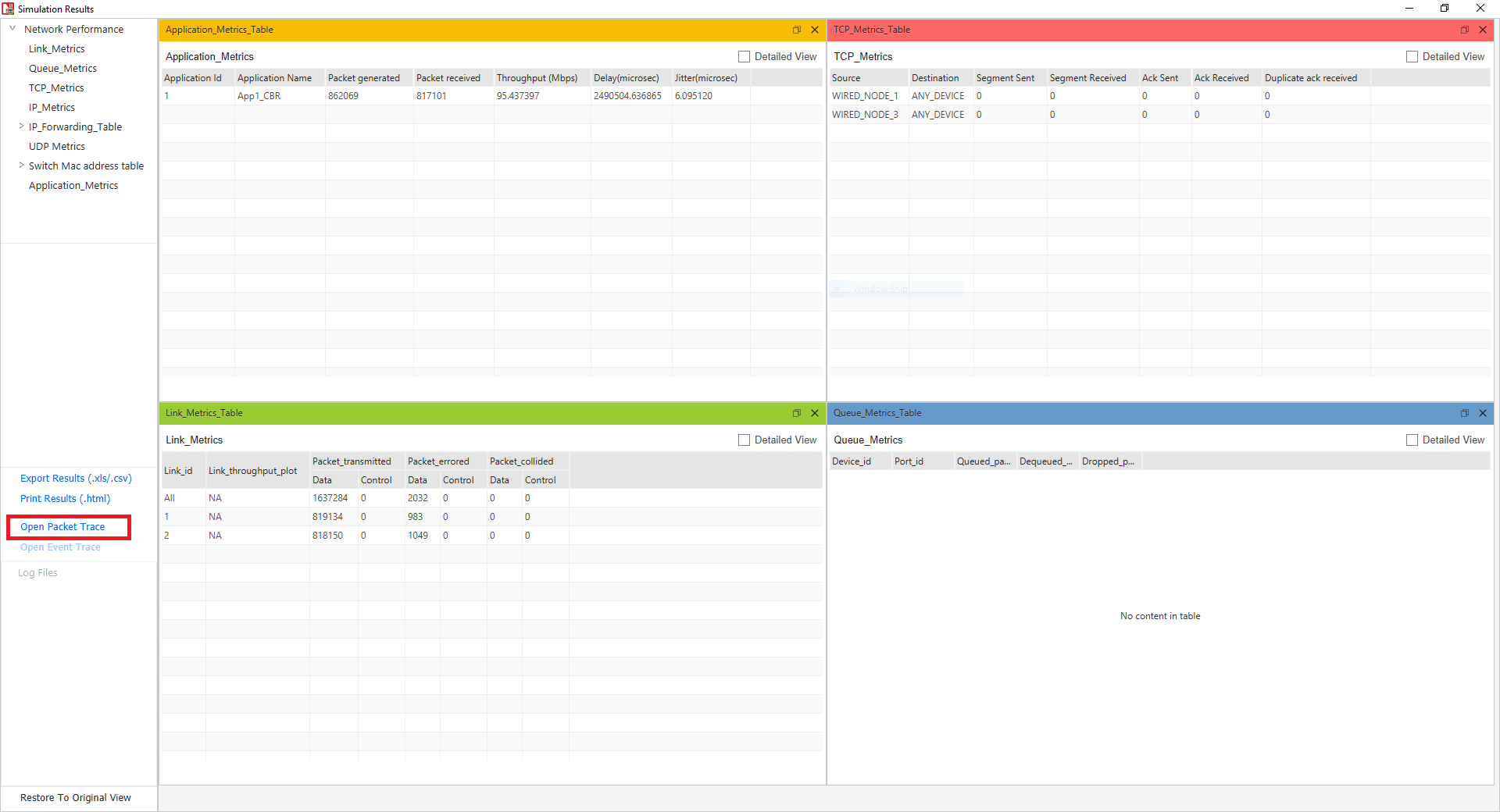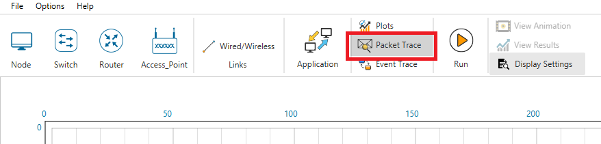 Step 2: After the simulation in Metrics window open Packet Trace.