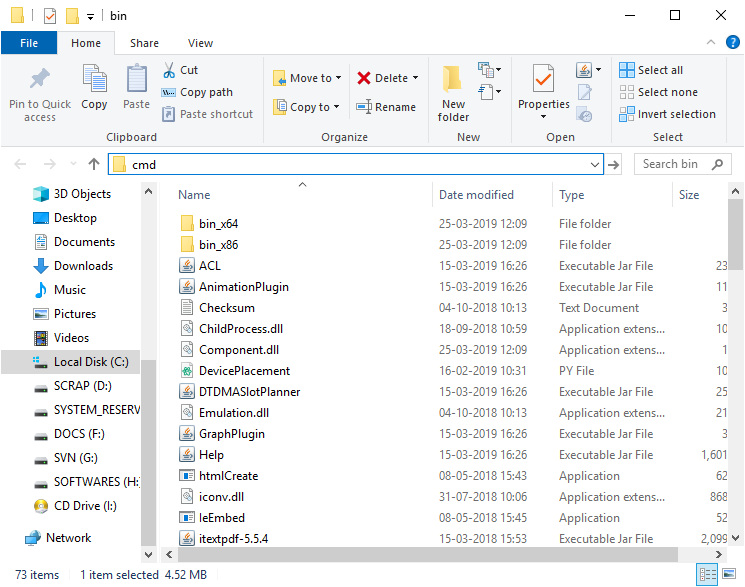 - Now open command prompt with NetSim bin folder as the current working directory. For this type cmd in the address bar of the file explorer and press enter.